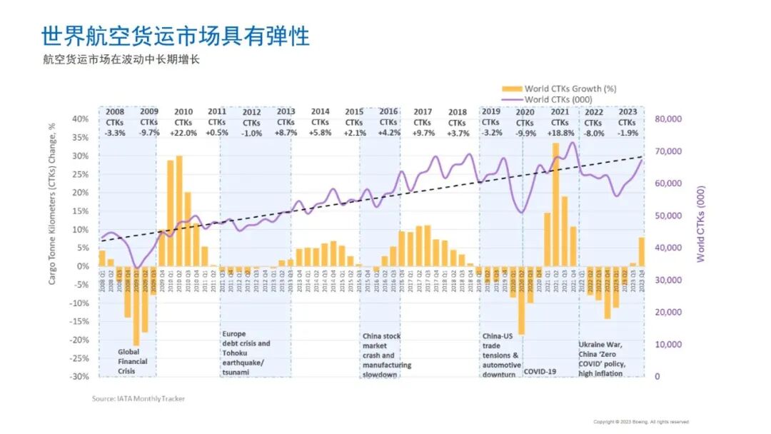 随着全球经济的周期性变化以及长期的增长趋势,航空货运市场也在波动中长期增长。每一次经济波动,例如金融危机、欧债危机、中美贸易战以及新冠疫情等事件都曾对航空货运市场造成非常大的影响。但统计过去十多年的季度数据可以发现,世界航空货运市场具有非常好的弹性,跌的越狠,反弹越高,能够在经历短期冲击后迅速恢复并实现报复性增长。例如,在金融危机期间,最低点跌了差不多22%,最高点则报复性增长了大约30%。
